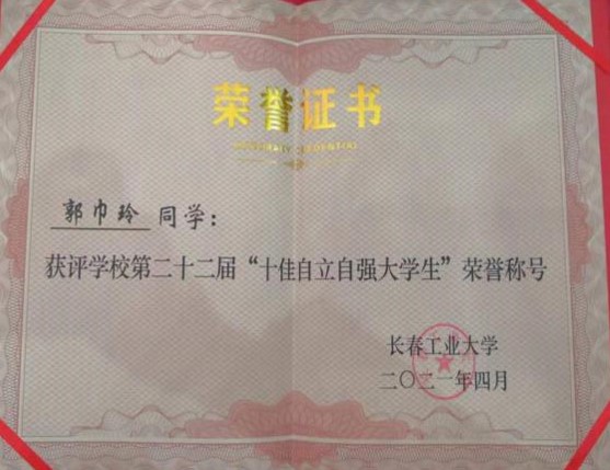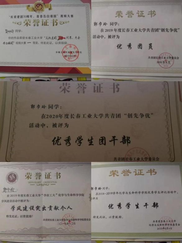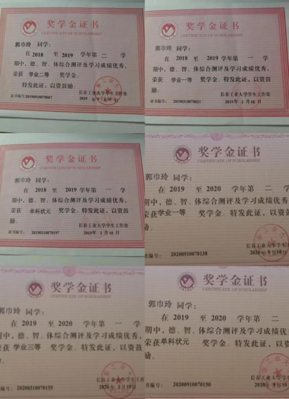 在校期间,曾获得2次国家励志奖学金,9次学业奖学金,3次单科状元;获得2020年度“长春市优秀共青团员”称号、bevictor伟德国际1946第二十二届“十佳自立自强大学生”、获得校第十六期青马班培训“优秀学员”、校“文明大学生”荣誉称号、校“优秀团干部”、校“优秀团员”,院“优秀学生干部”“学风建设突出贡献个人”等。在学院内开展学习经验分享会,分享学习心得,考研心得,帮助学弟学妹们复习方向及方法,激发同学们学习的热情。