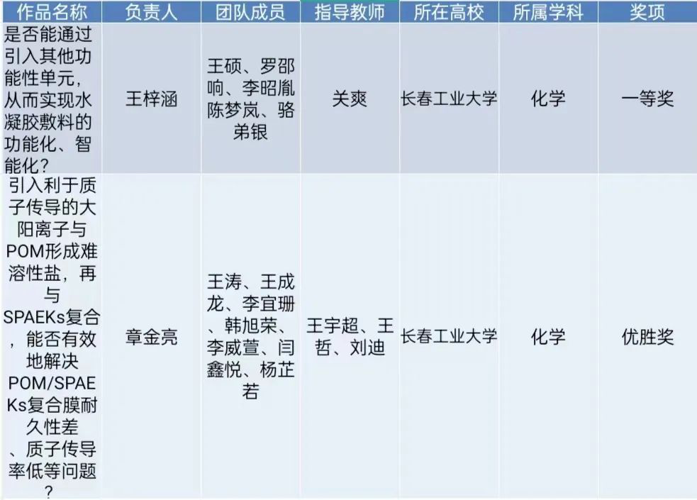 9月11日,由吉林省教育厅主办的首届吉林省基础学科拔尖学生“提问与猜想”活动拟获奖名单公布,经高校推荐、专家评审、组委会研究,拟授予 3 项作品特等奖、8项作品一等奖、15 项作品二等奖、22 项作品优胜奖。由我院关爽老师指导、王梓涵等同学完成的《是否能通过引入其他功能性单元,从而实现水凝胶敷料的功能化,智能化?》获得一等奖,王宇超老师指导、章金亮等同学完成的《引入利于质子传导的大阳离子与POM形成难溶性盐,再与SPAEKs复合,能否有效地解决POM/SPAEKs复合膜耐久性差、质子传导率低等问题?》荣获优胜奖!