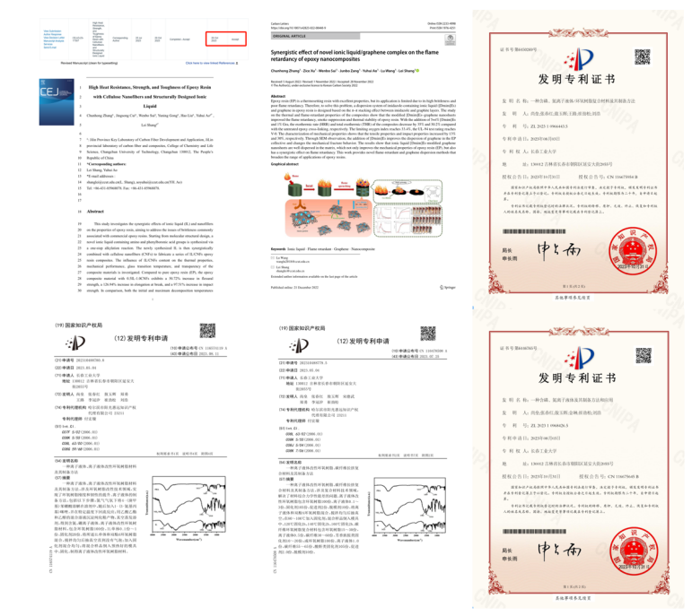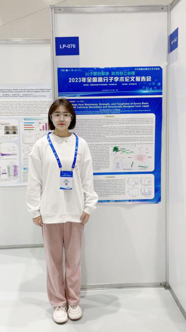 “青春岁月,当立鸿鹄志,做奋斗者。”作为一名理工科专业的学生,她怀揣着科技报国的理想追求,不断地扎实本领,上下而求索。“一代人有一代人的长征,我们成长在这个最好的时代,更应该把个人前途与国家发展相结合。”科研方面,她发挥党员在科研工作中的先锋模范作用,主动积极参与实验室建设工作,科研学术交流与党员学习活动相辅相成,以第一作者在化学领域Top期刊中科院大一区Chemical Engineering Journal发表SCI论文1篇(IF:15.1),Carbon letters 答辩SCI论文1篇(IF:4.5)申请发明专利10项,其中第二作者4项(导师第一),授权发明专利2项,目前授权专利中所研发技术正参与国产车载碳纤维储氢气瓶关键技术及产业化开发;同时她参与吉林省重大科技专项课题项目1项,吉林市科技创新发展计划项目1项,其论文《High Heat Resistance, Strength, and Toughness of Epoxy Resin with Cellulose Nanofibers and Structurally Designed Ionic Liquid》被2023年全国高分子学术论文报告会录取,并在大会墙报进行展示,多次在组内开展学术科研交流活动,引领实验室成员在科研道路上攻坚克难,增强组内同学凝聚力,其工作受到了老师、同学们的一致好评,起到了党员示范作用。