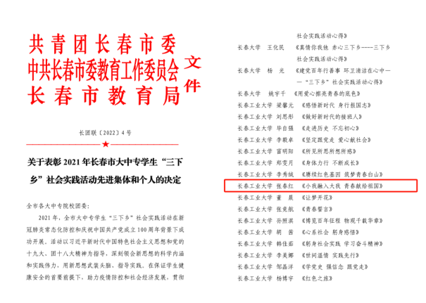 “在这大有可为的新时代,作为青年党员,应当用内心感应时代脉搏,用耳朵倾听人民呼声,将青春与赤诚奉献给祖国和人民。”2021年7月,为加强引领广大青年学生深入学习贯彻习近平新时代中国特色社会主义思想,特别是习近平总书记关于青年工作的重要思想,扎根中国大地,了解国情民情,她带领社会实践小分队积极响应白山市委市政府号召,22日清晨,前往白山,参与了2021年“赓续红色百年·筑梦青春白山”百所高校进白山全国大学生暑期社会实践专项活动,走进了白山市浑江区。在2021年长春大中专学生志愿者暑期文化科技“三下乡”社会实践活动中撰写的随笔《小我融入大我,青春献给祖国》获评长春市暑期三下乡市级“优秀随笔”荣誉称号;所在团队被评为市级优秀团队;获“社会实践活动先进个人”荣誉称号;