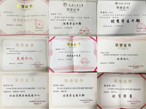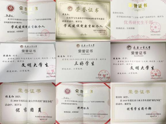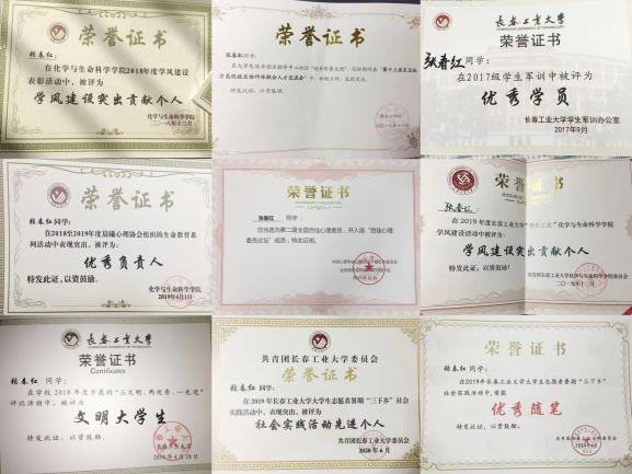 她曾作为化生学院大学生心理工作委员会会长,关心集体,能够及时反映情况,在同学中有较高的号召力,作为主负责人举办了心理剧大赛、生命健康心理系列活动、“冬至暖阳”送信活动等15项活动,曾带领团队参与关爱自闭症儿童志愿者服务等,既锻炼了交际能力,又增长了社会经验,特此荣获第二届全国“百佳心委”荣誉称号、第五届bevictor伟德国际1946“工大之星”荣誉称号、校“文明大学生”、校“优秀学生干部”、校“优秀研究生干部”、校“优秀团干部”、校“优秀团员”等荣誉称号20余次;