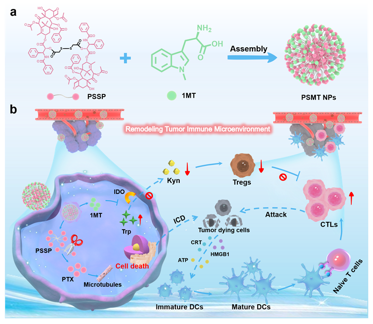 本网讯(通讯员:刘扬)为了克服化疗药物和免疫调节剂的生物利用度低且具有严重的脱靶毒性等问题,我院郑敏教授团队通过紫杉醇(PTX)前药PSSP和吲哚胺2,3-双加氧酶1(I DO1)抑制剂(1-甲基-色氨酸,1MT)的超分子组装构建了自载体纳米颗粒(PSMT NPs),用于肿瘤特异性化学免疫治疗。在被癌细胞内化后,PSMT NPs可以对内源性氧化还原刺激做出反应,并释放PTX和1MT。释放的PTX不仅可以通过干预细胞有丝分裂促进细胞凋亡,还可以启动免疫原性细胞死亡(ICD)以促进肿瘤浸润性细胞毒性T淋巴细胞(CTLs)的募集和激活。与此同时,1MT可以抑制IDO活性以耗尽调节性T细胞,从而协同激活CTLs。PSMT NPs对三阴性乳腺癌显示出增强的抗肿瘤治疗效果和可忽略的系统毒性。本工作提供了一种简便的方法来递送化疗和免疫调剂药物,以实现化疗增强的免疫治疗。