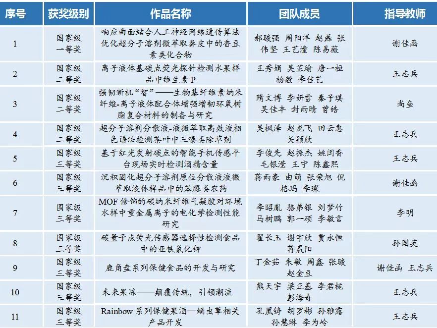 我院共有37支队伍参赛,经过前期资格审查、网络评审、省赛环节,我院有两支队伍进入决赛,决赛采取现场答辩的方式进行,由现场汇报、评委提问、评委现场亮分等环节组成。学院参赛学生团队反复打磨完善参赛作品,在决赛中沉着冷静、思路清晰、自信应答,获得评委的认可。由我校伟德国际victor1946谢佳函老师指导,郝骏强同学带领的《响应曲面结合人工神经网络遗传算法优化超分子溶剂微萃取秦皮中的香豆素类化合物》荣获国家级一等奖,由尚垒老师指导、隋文博同学带领的《强韧新机“智”——生物基纤维素纳米纤维-离子液体配合体增强增韧环氧树脂复合材料的制备与研究》等3项作品荣获国家级二等奖,由孙国英老师指导、翟长玉同学带领的《碳量子点荧光传感器选择性检测食品中的亚铁氰化钾》等7项作品荣获国家级三等奖。另荣获省级二等奖4项、三等奖9项。