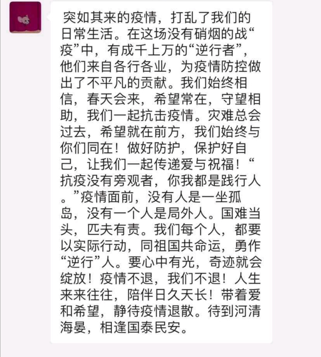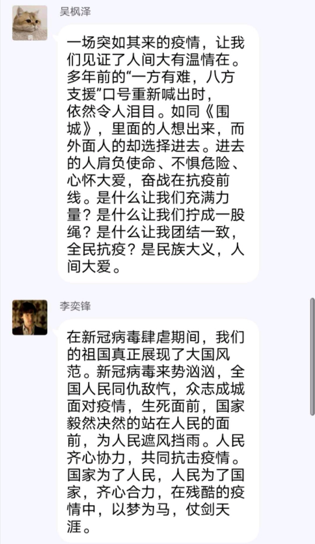 在课程结束后,我院党委副书记徐秉锋说到“沧海横流,方显英雄本色”。这是一次突如其来的大疫,是中华民族复兴的一次世纪大考。在这场战“疫”中,勇敢与牺牲,难以计数;平凡与伟大,时刻演绎。“当前“疫情如火,军令如山”,每一个工大人都要秉持“国有危难,使命就是号角;紧要关头,初心就是方向。”时时不放松,刻刻不松懈,彻底打赢疫情防控的阻击战、防控战。坚决克服麻痹思想、厌战情绪、松劲心态。并以此次抗“疫”为契机,将立德树人贯彻到教育教学全过程、全方位、全员之中,引导广大青年学生树立责任担当意识,激发爱党爱国情怀;帮助青年学生们铸就理想信念、掌握知识本领,真正成长为社会主义事业的合格建设者和可靠接班人。