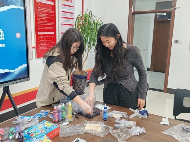 活动伊始,大家共同学习扎染技巧,借助皮筋、夹子等工具进行折叠、缠绕与固定,认真构思纹样、相互交流创意,释放压力、舒缓心情,沉浸式感受传统手工艺的创作乐趣。