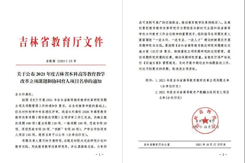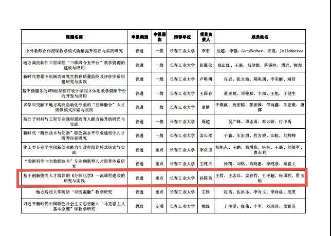 近日,吉林省教育厅公布了2021年度吉林省本科高等教育教学改革立项课题名单,由我院副院长孙国英教授主持的“基于创新拔尖人才培养的《分析化学》一流课程建设的研究与实践”获得立项,并被列为重点项目!