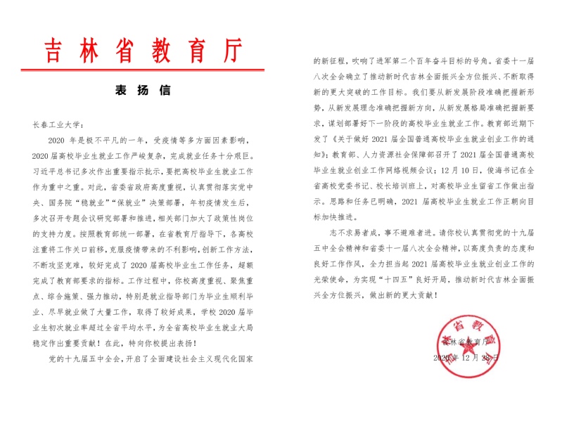 学校征兵工作获吉林省教育厅表扬