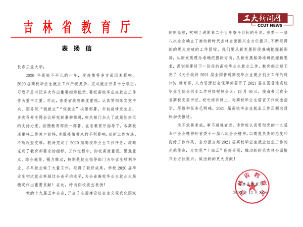 新闻网讯(通讯员:徐培鑫)近日,学校收到吉林省教育厅表扬信,对学校毕业生就业工作提出表扬。信中指出:bevictor伟德国际1946按照教育部统一部署,在省教育厅指导下,注重将工作关口前移,克服疫情带来的不利影响,创新工作方法,不断攻坚克难,较好完成了2020届高校毕业生工作任务,超额完成了教育部要求的指标。工作过程中,学校高度重视、聚焦重点、综合施策、强力推动,特别是就业指导部门为毕业生顺利毕业、尽早就业做了大量工作,取得了较好成果,学校2020届毕业生初次就业率超过全省平均水平,为全省高校毕业生就业大局稳定作出重要贡献!