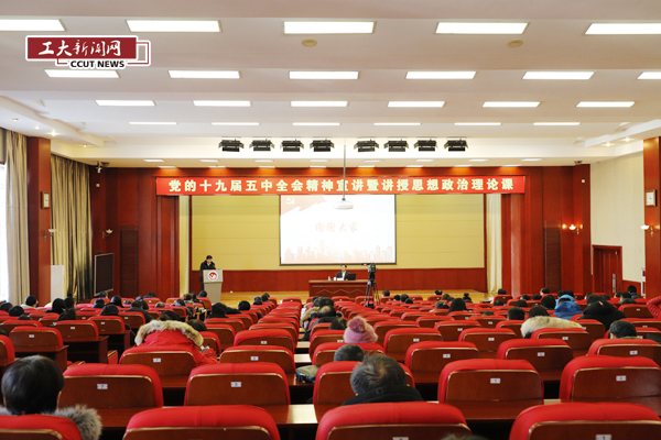 讲思政课环节由校长张会轩主持。张会轩指出,李景浩常委走进学校讲授思政课,充分体现了贯彻落实党的十九届五中全会精神的鲜明态度,充分体现了对高等教育发展和青年学生成长的重视厚爱,充分体现了对学校科学做好“十四五”规划的鞭策鼓舞。李景浩常委的讲解主题鲜明,重点突出,深入透彻,既有理论高度,又有理解深度,既有深邃的思想内涵,又有丰富的信息含量,为学校深入学习理解、全面贯彻落实党的十九届五中全会精神提供了有力指导和重要遵循。全校上下要把学习宣传、贯彻落实党的十九届五中全会精神作为当前和今后一个时期首要任务,进一步掀起学习宣传贯彻热潮。要坚持在深入学习贯彻全会精神中,进一步坚定信心、统一思想、凝聚共识,牢牢抓住新发展机遇,贯彻落实新发展理念,加快融入新发展格局,紧密结合吉林经济社会发展所需,深度对接重大战略政策,高标准、高水平、高效率地做好学校“十四五”发展规划。要坚持以习近平新时代中国特色社会主义思想为指导,不折不扣地贯彻落实党的十九届五中全会精神,不忘工业报国初心,牢记立德树人使命,攻坚克难,锐意进取,改革创新,扎实推进学校事业高质量发展,以新担当、新突破、新作为,融入吉林发展,努力为新时代吉林全面振兴全方位振兴奉献工大智慧、展现工大风采、做出工大贡献。