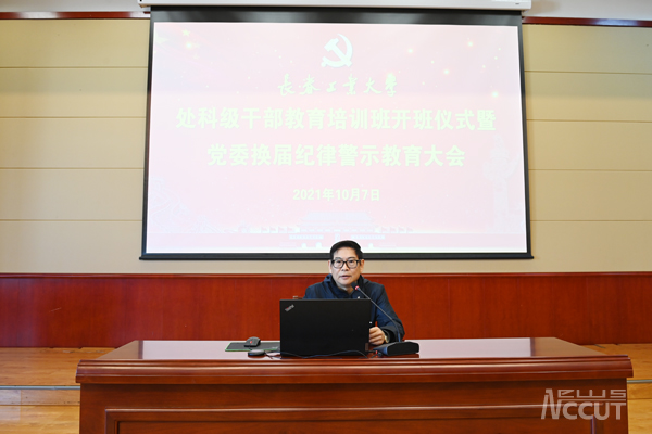 新闻网讯(通讯员 祝盛)10月7日,学校处科级干部教育培训班开班仪式暨党委换届纪律警示教育大会在南湖校区学术报告厅召开。学校领导、全体中层干部参加了会议,科级干部通过企业微信同步观看直播。会议由党委副书记孟雷主持。