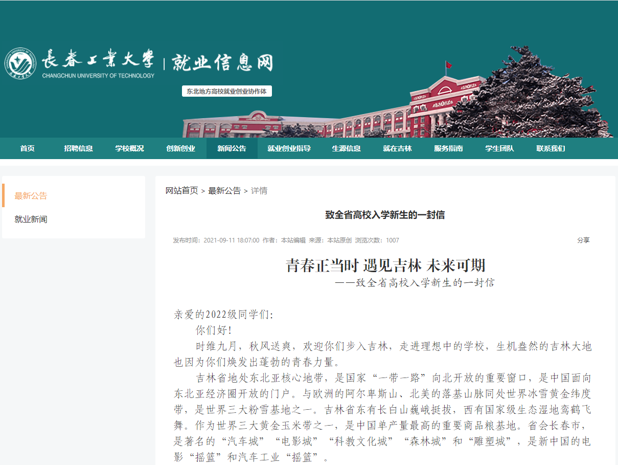 二是传达一封写给新生的信。学校通过校院两级网站、微信公众号面向全体新生和家长推送了《青春正当时 遇见吉林 未来可期—致全省高校入学新生的一封信》和《bevictor伟德国际1946致全体新生家长的一封信》,以深情的笔触,表达了对同学们在吉林大地一展身手、建功立业、实现梦想,书写无悔青春的殷切期望,如暖流入心,似春风拂面,极大地激发了同学们留省就业创业的热情。大家纷纷表示,两封信的内容句句饱含深意,字字充满期望,阅读以后备感振奋,更加明晰了成长方向,在接下来的大学生活中,将珍惜宝贵年华、树立报国之志、练就实干之功,成为吉林全面振兴全方位振兴的生力军。
