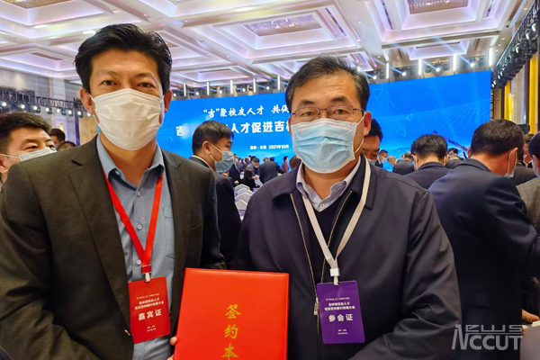 在大会项目签约仪式上,张明耀与我校2004届校友、天津玛斯特车身装备技术有限公司创始人、CEO郑松刚签订校企合作协议。我校80届校友、全国政协委员、梦都美集团董事长李成日代表我校校友接受了吉林电视台专访。